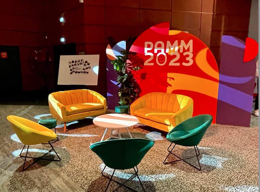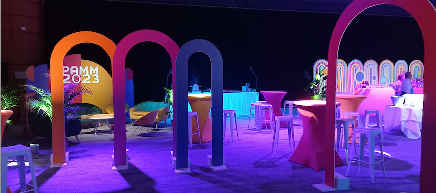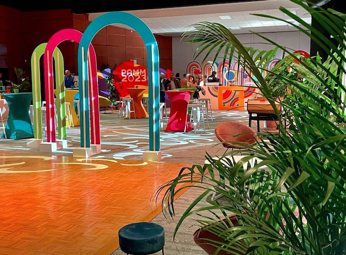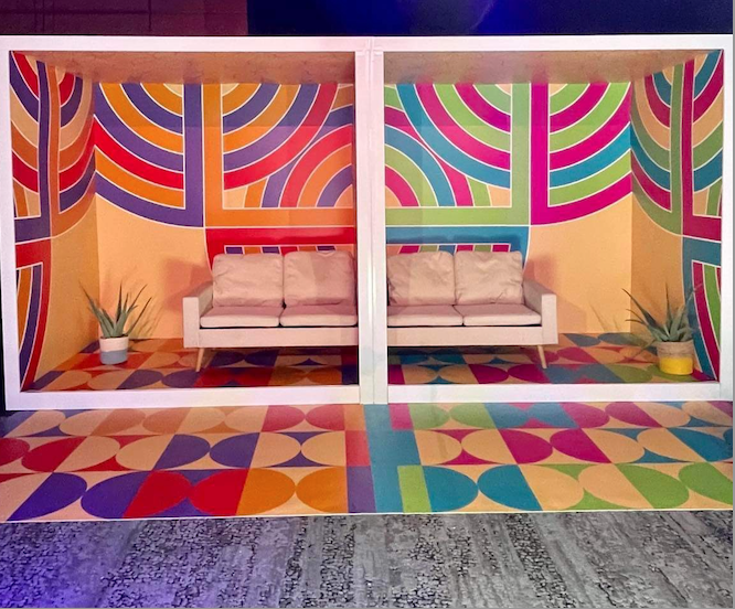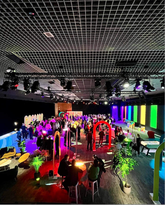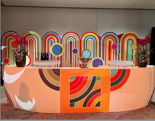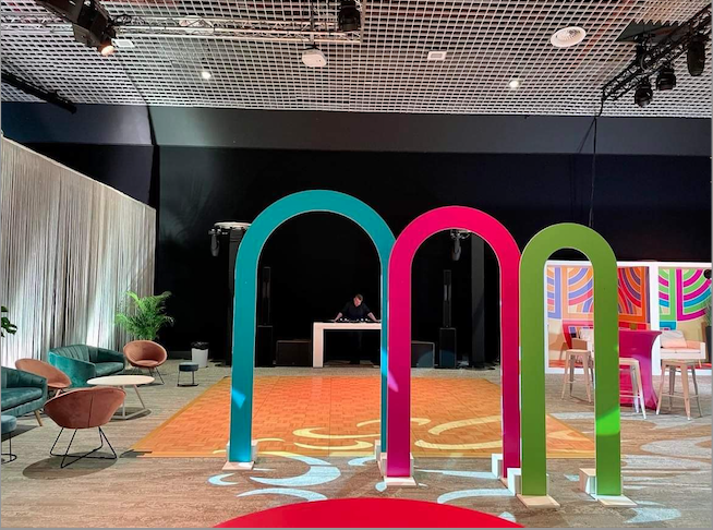 Dès le premier pas, les invités étaient plongés dans un univers de formes géométriques et de couleurs vives avec au centre de la pièce : un bar au décor sur mesure et aux couleurs de l'artiste, un photocall immersif et ludique, des espaces salons aménagés avec des coussins colorés et une mise en lumière décorative