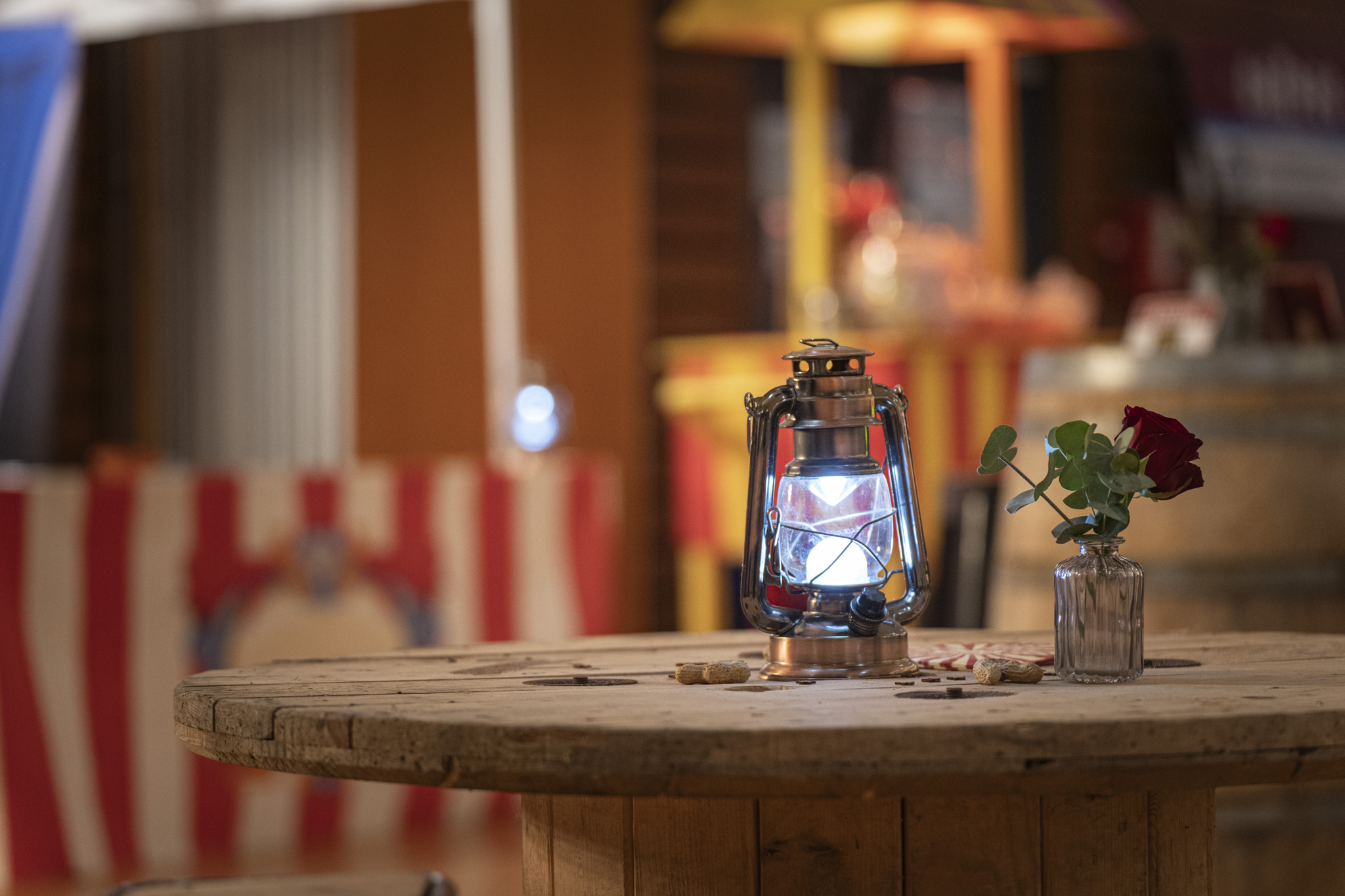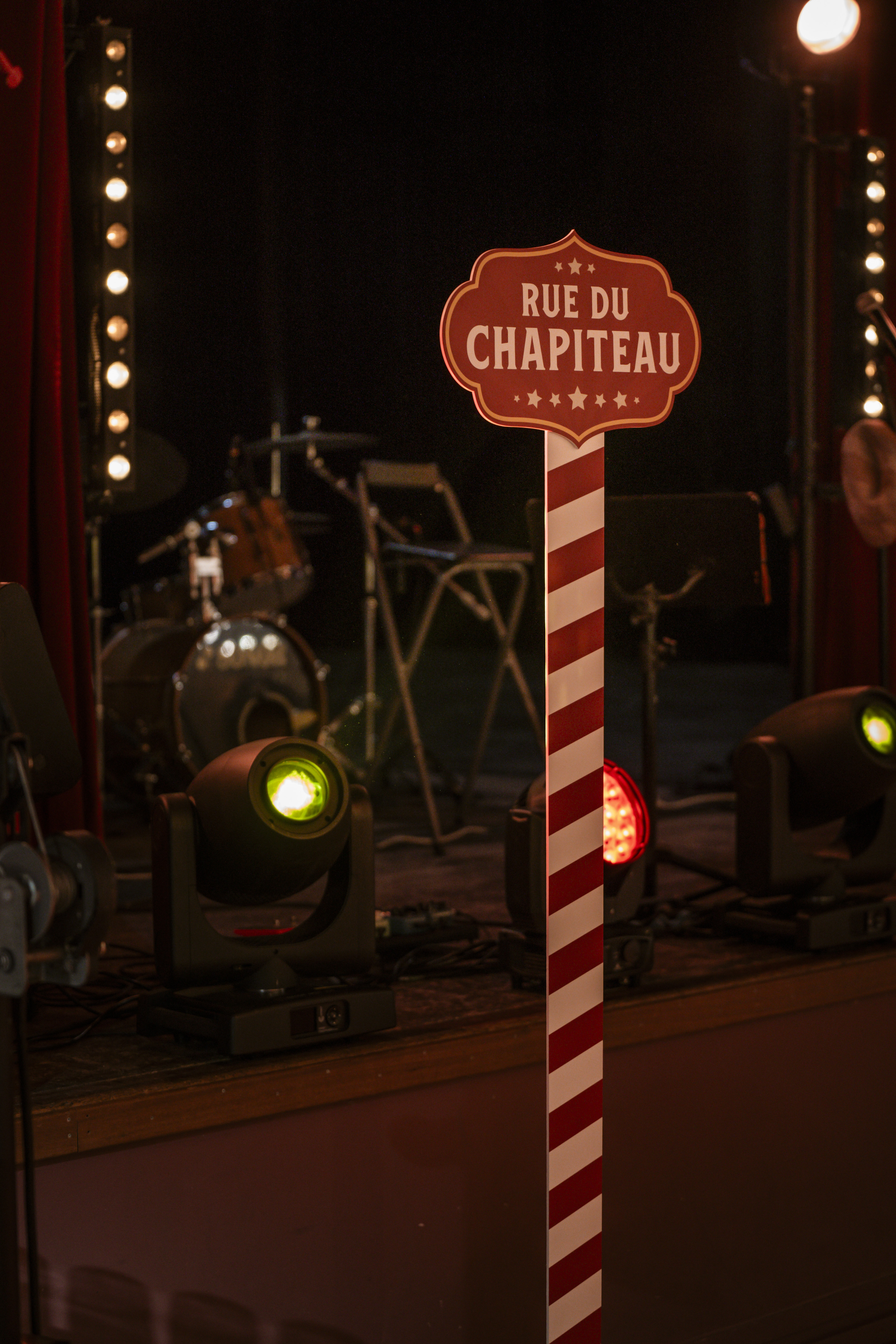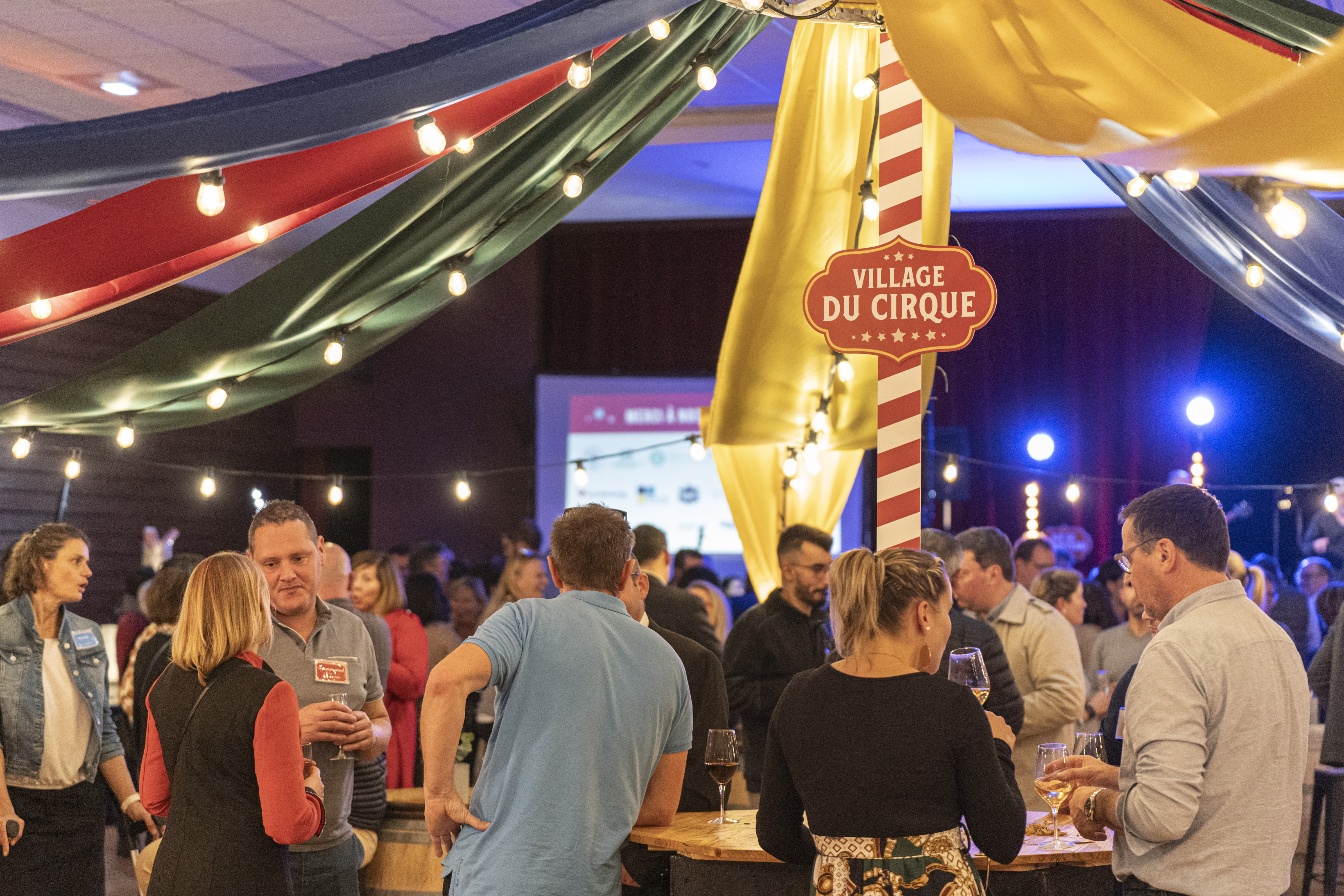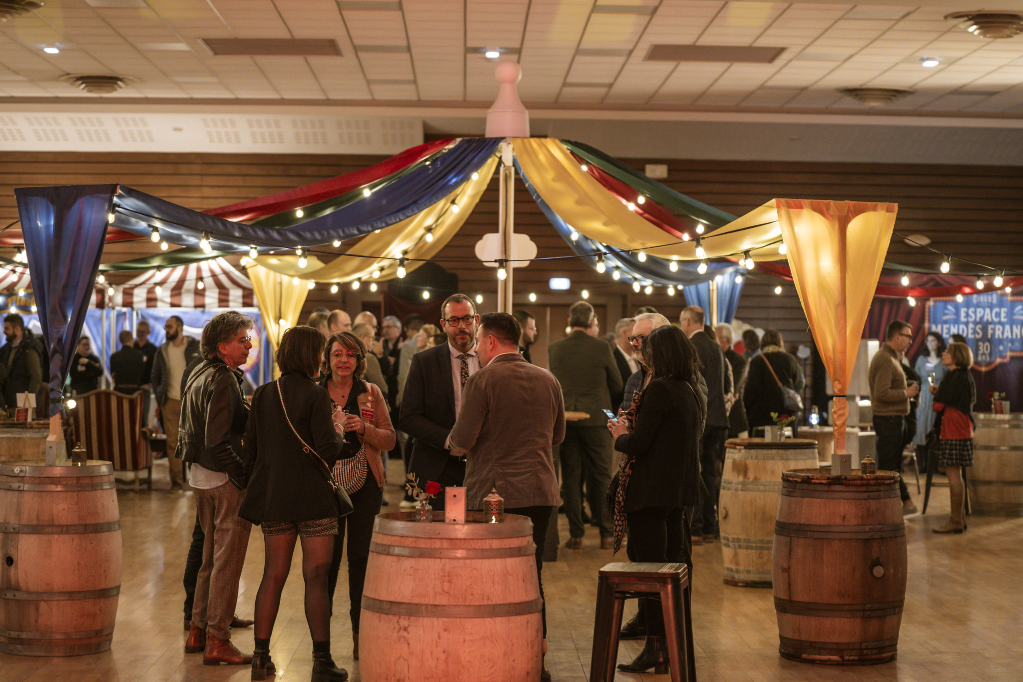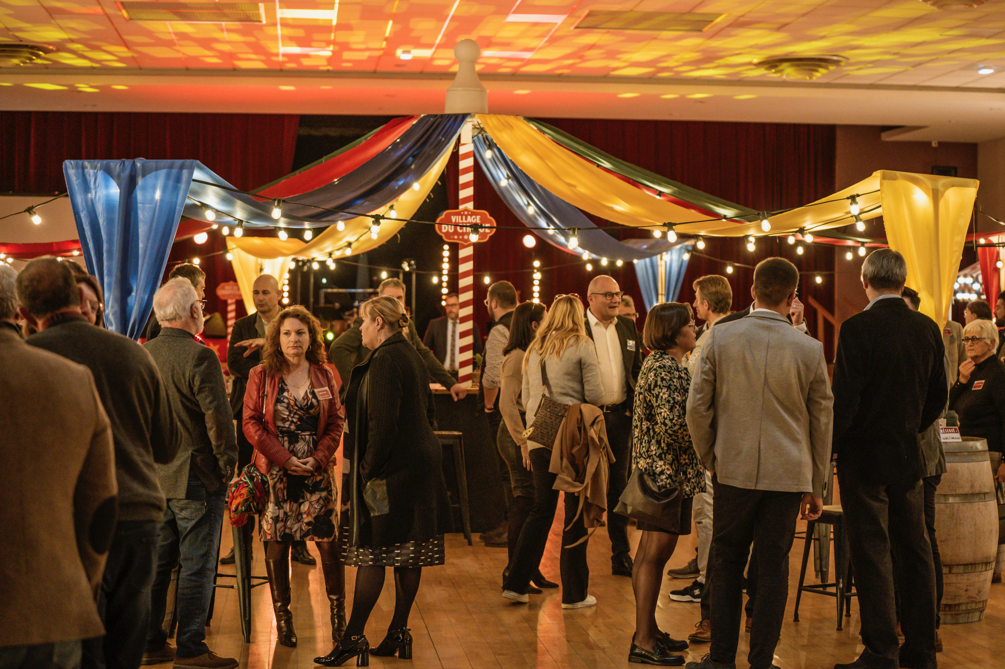 Accueilli par une entrée de cirque majestueuse, la pièce principale est métamorphosée en une scène de cirque d'époque avec un chapiteau orné de guirlandes colorées et lumineuses.